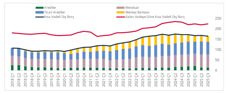 Türkiye’nin Kısa Vadeli Dış Borç (KVDB) stoku, eylül ayında 165,8 milyar dolar olurken orijinal vadesine bakılmaksızın vadesine 1 yıl veya daha az kalmış borçları gösteren kalan vadeye